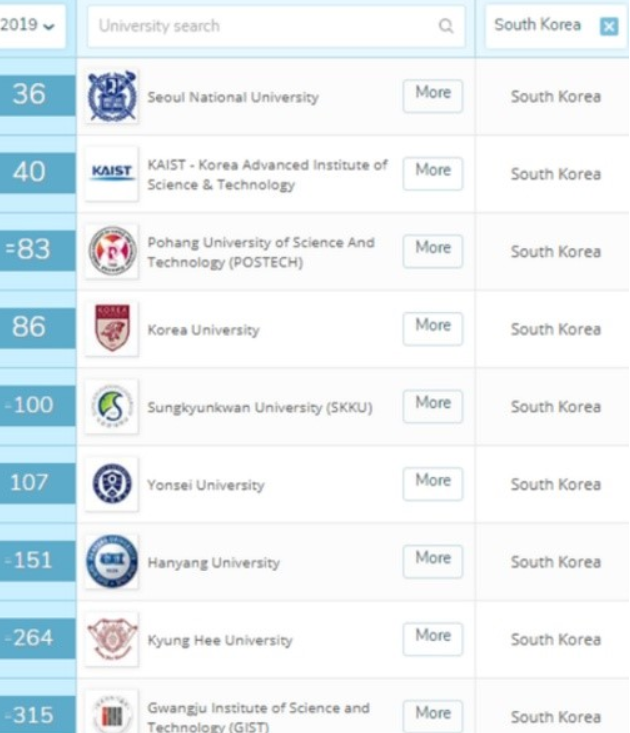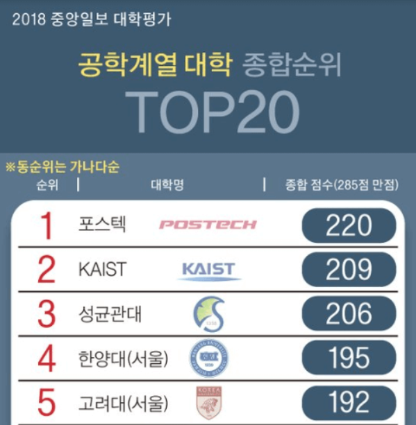 그리고 6위는 UNIST, 7위가 서울대, 8위가 서울의 연세대, 9위는 경희대와 서강대가 나란히 차지를 했고 11위는 중앙대, 12위는 코리아텍, 13위는 한양대(ERICA), 14위는 서울의 동국대와 인하대가 공동으로 차지를 했으며 16위의 경우에도 국민대와 서울 시립대가 나란히 차지를 했고 18위는 아주대, 19위는 부산대, 20위는 서울 건국대 순으로 매겨졌습니다.