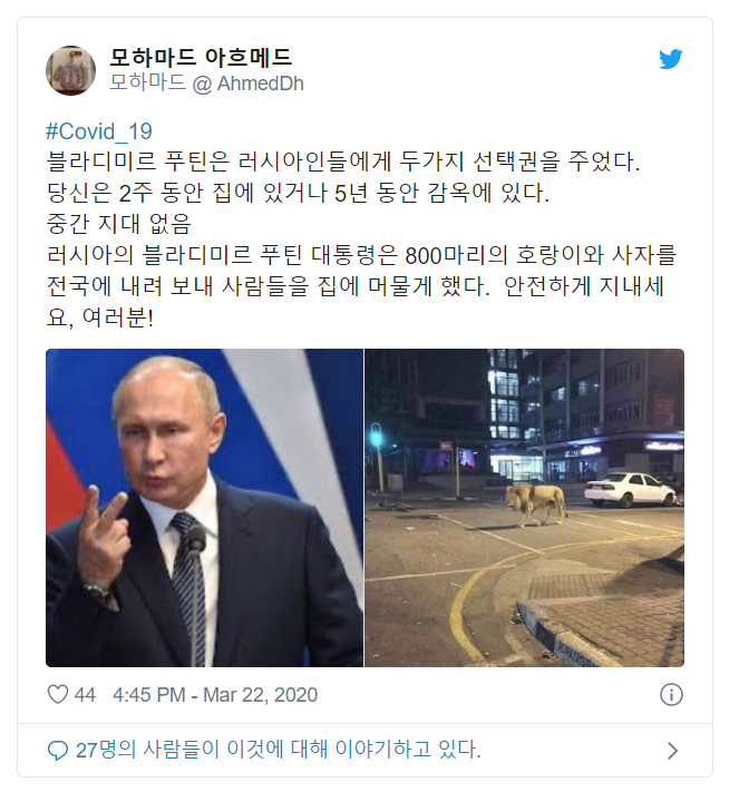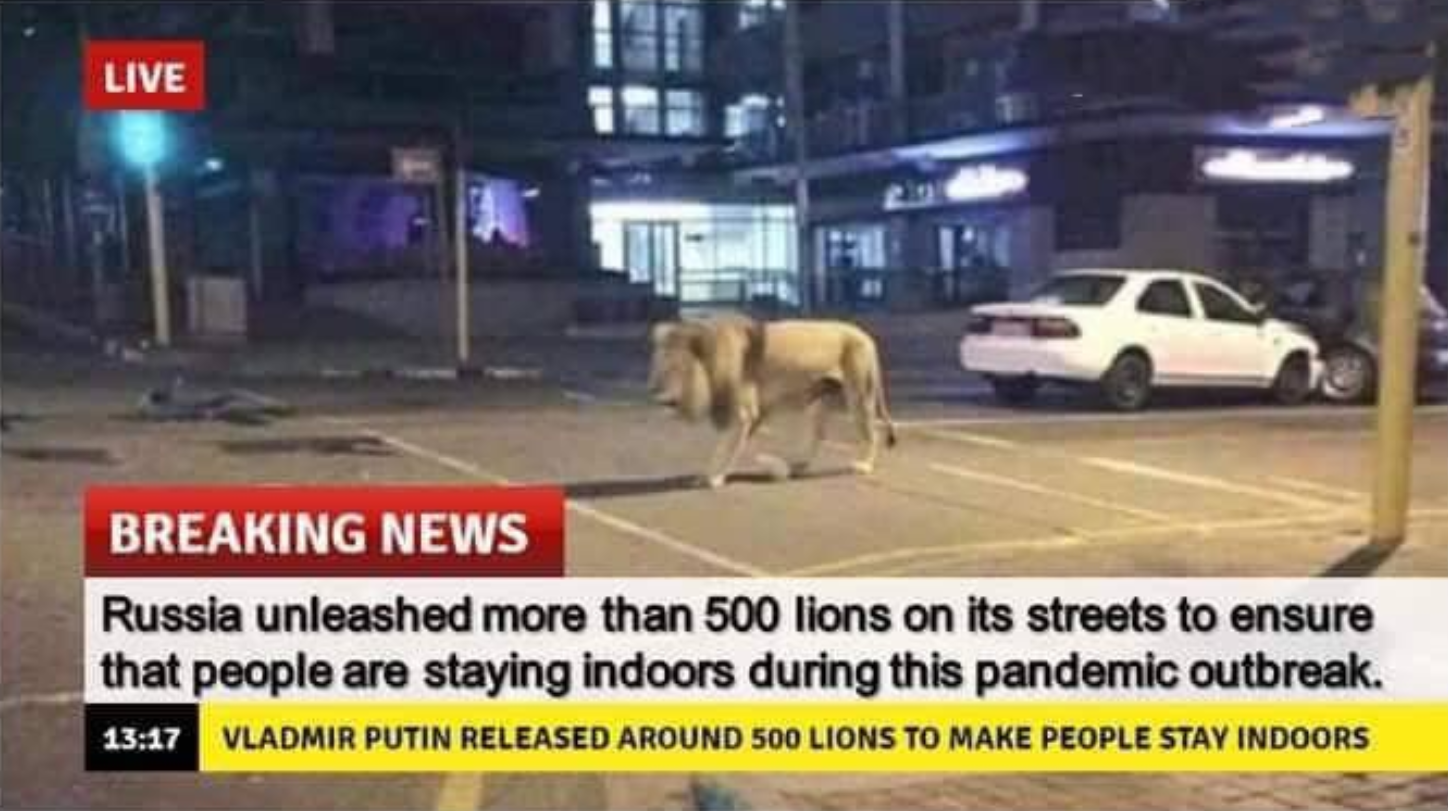 러시아 대통령이 사람들이 집 안에 머물도록 하기 위해서 러시아 거리에 500 ~ 800마리 가량의 사자와 호랑이들을 풀어두라고 명령했고 그로 인해서 실제로 러시아 거리에는 외출하는 사람들을 막기위한 사자들이 돌아다니고 있다는 루머가 퍼졌었는데요.