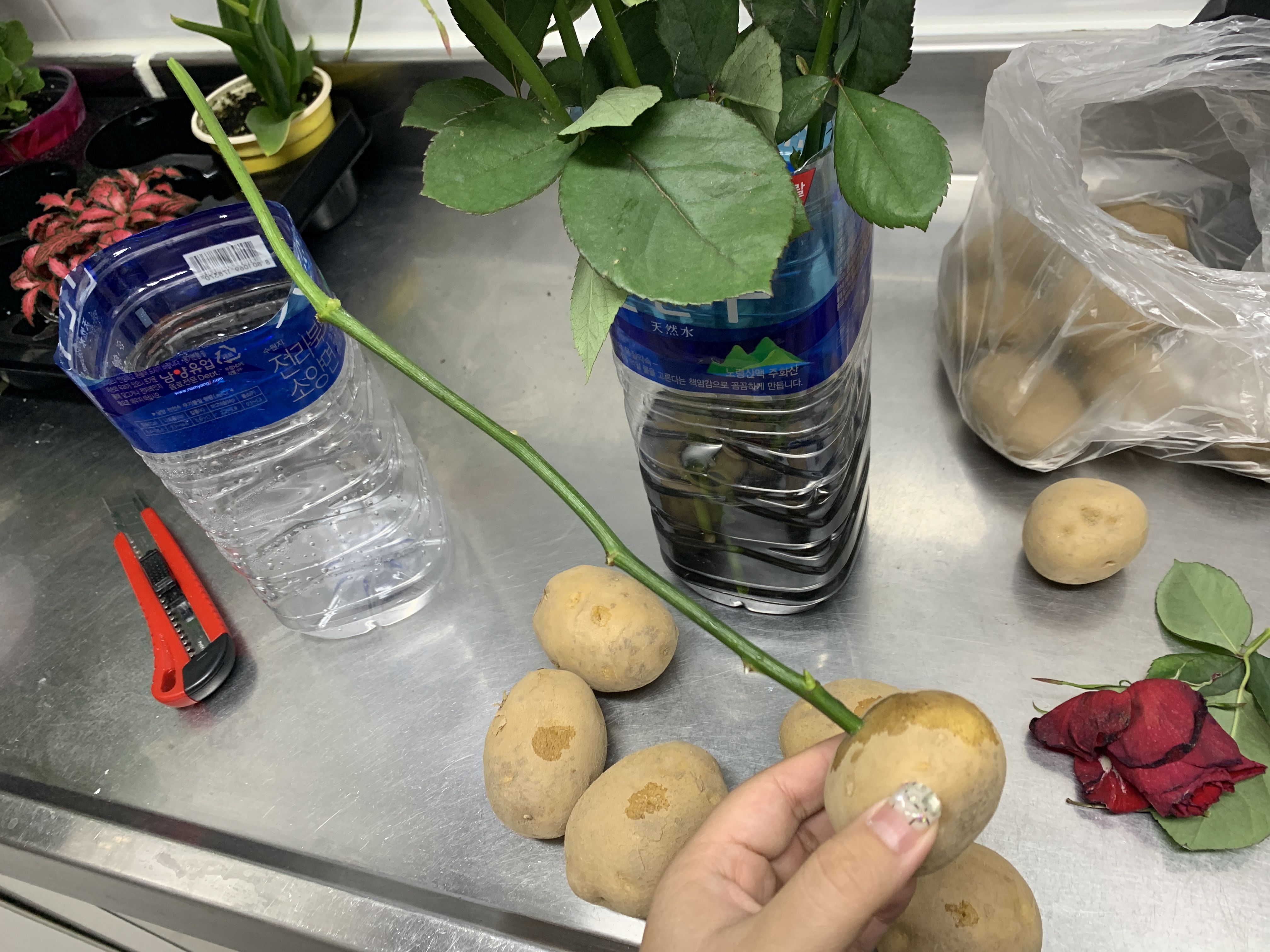 장미 대가 뿌리를 더 쉽고 빠르게 내리게 하기 위해서 감자를 사용해줄건데요. 그렇기 때문에 대를 감자에 꽂아줄겁니다. 이때 스크래치 없이 바로 감자에 대를 꼽으면 대 부분이 부러지거나 휘어지기 때문에 그걸 예방하기 위해서 미리 넣기전에 가위나 칼로 잘 들어갈 수 있도록 일부분을 파내어주고나 열십자로 간단하게 감자를 그어주시는 것이 좋습니다.