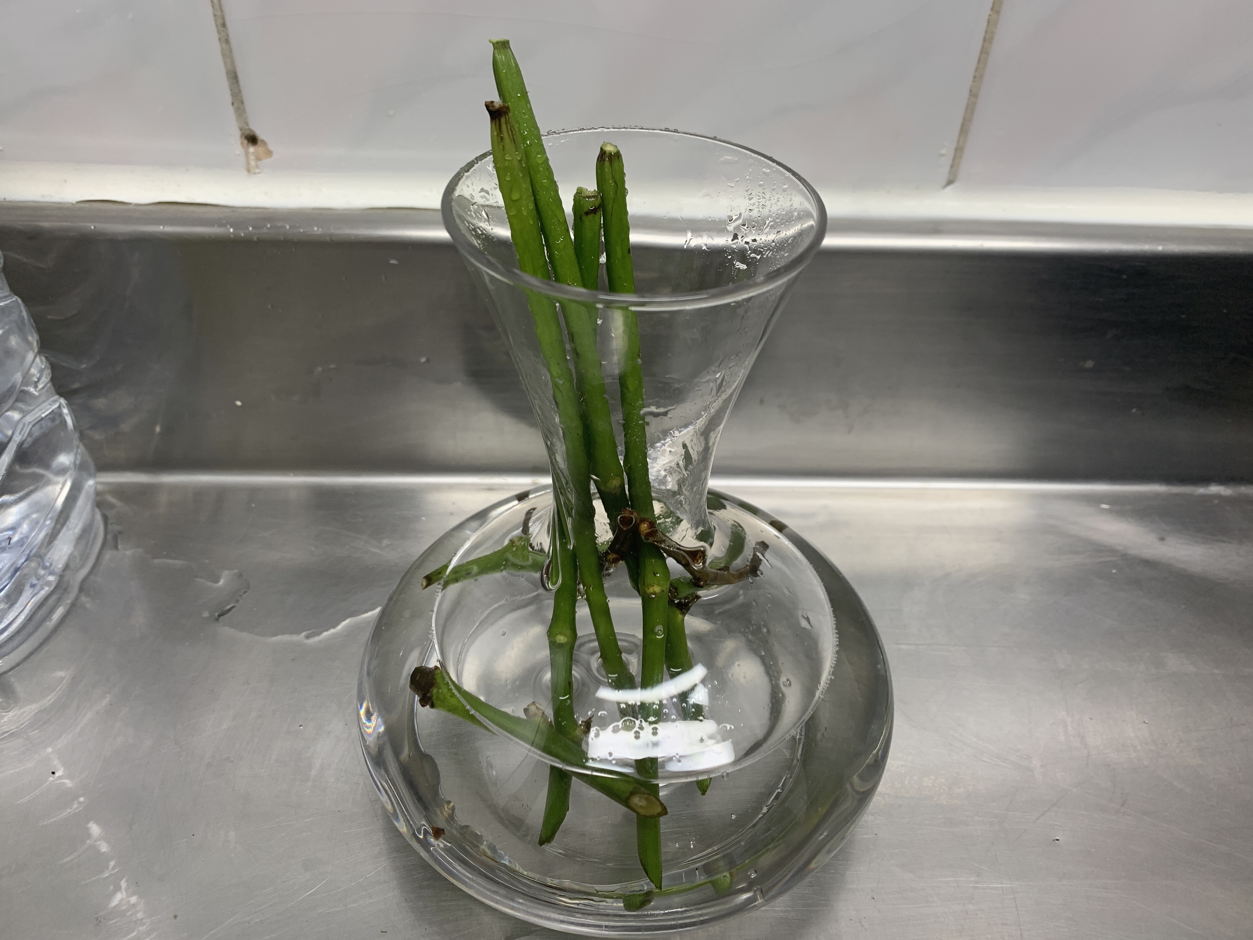 그래서 장미 삽목 방법대로 바로 진행을 하기로 했죠. 장미 꽃다발로 따라하셔도 좋고 꽃다발이 아니라면 장미 꺽꽂이로 진행을 하셔도 좋습니다. 굵은 장미의 가지를 너무 길지도 짧지도 않게 손바닥의 세로폭 정도 길이로 자르시면 되는데요. 길이는 꼭 맞추실 필요까지는 없고 그보다 조금 더 크거나 그보다 조금 더 짧아도 상관 없습니다.