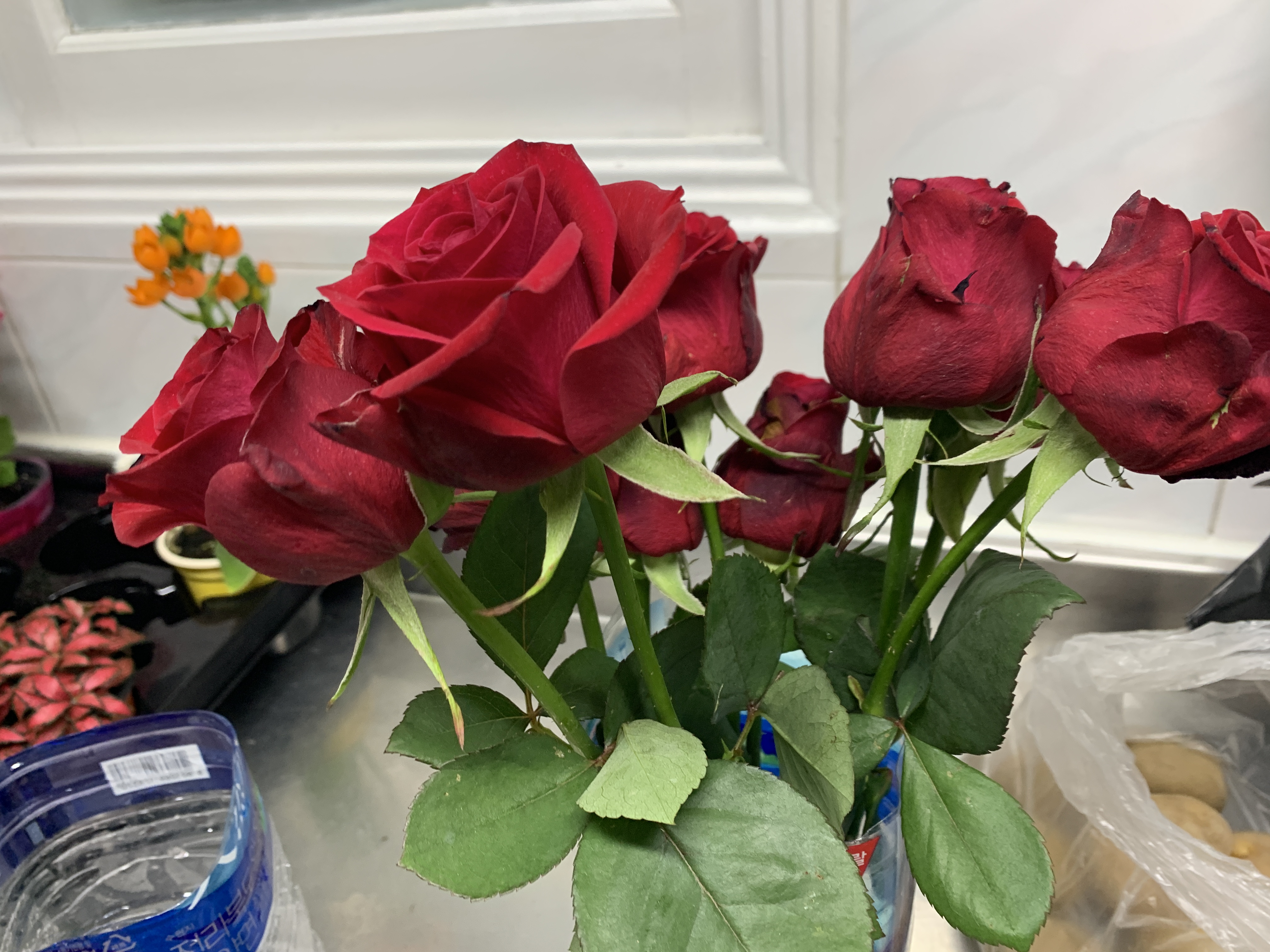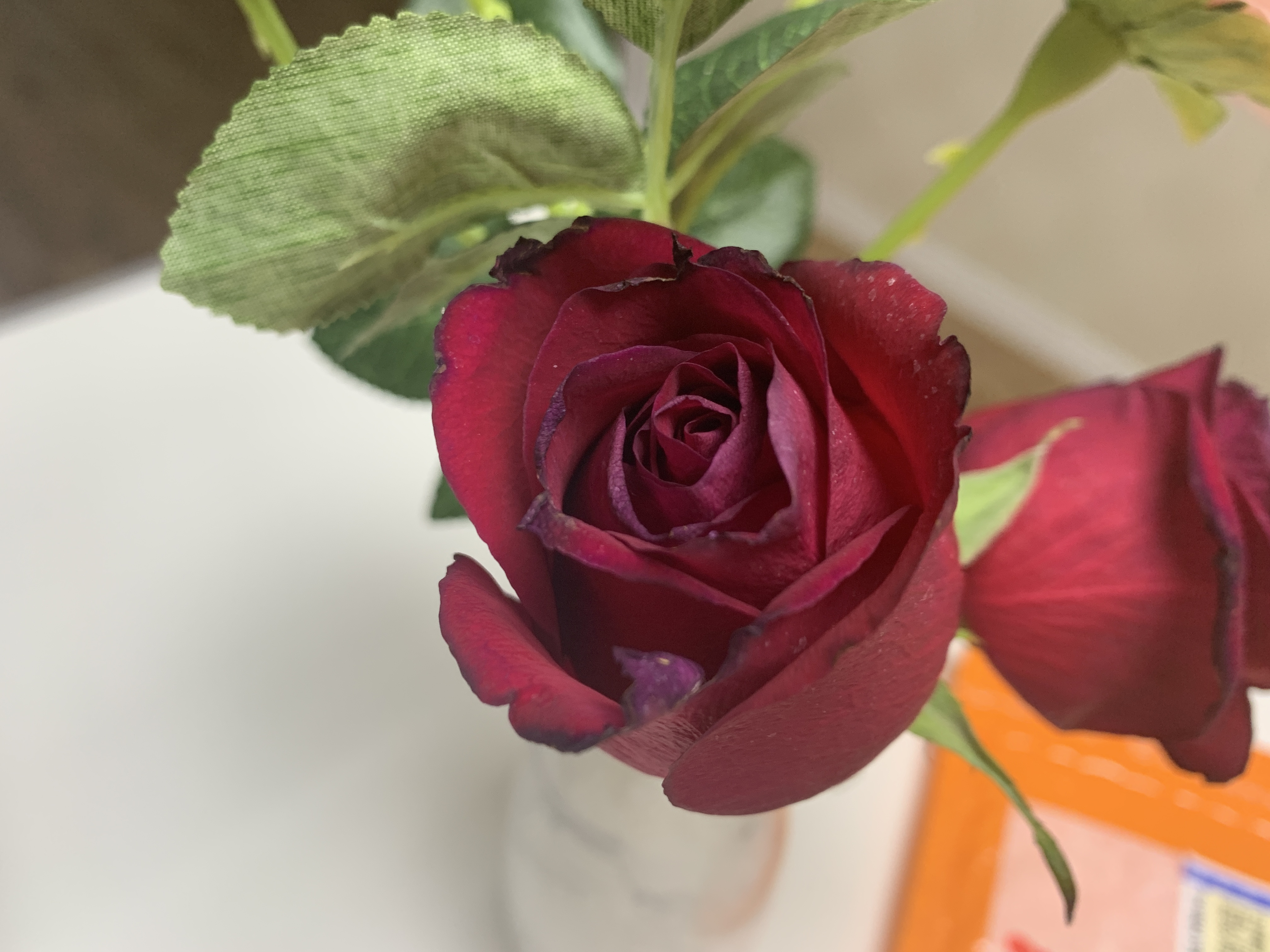몇일 시일이 좀 지난 상황인데요. 일부 장미는 여전히 싱싱하고 화사하게 피어있었지만 그 중에 반정도는 시들어가고 있기도 하고 꽃잎이 힘을 잃어가면서 색이 거무죽죽하게 변하는 느낌이 들더라고요. 사진상에서도 일부분 확인하실 수 있으실거예요.