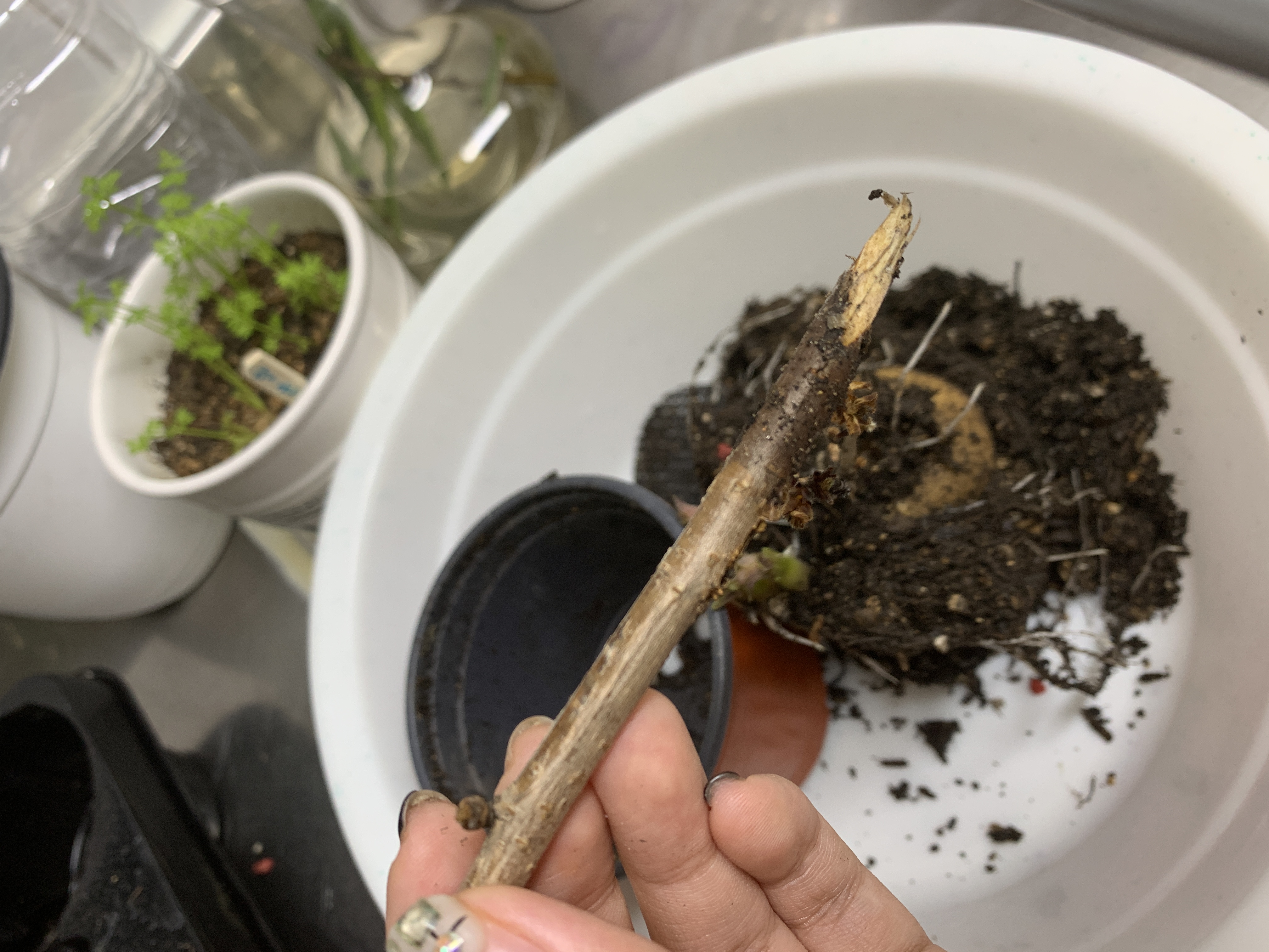 위에 사진에 있는 이건 동백꺽꽂이를 해서 삽목할때 같은날 심었던 벚꽂삽목을 한 건데요. 옆에보시다 시피 꺼내보니까 잎이 무성하게 나있고 뿌리도 나있는데 정작 발근제 역할을 위해서 듬뿍 꿀을 발라두었던 나뭇가지 부분에는 뿌리가 하나도 없었어요.