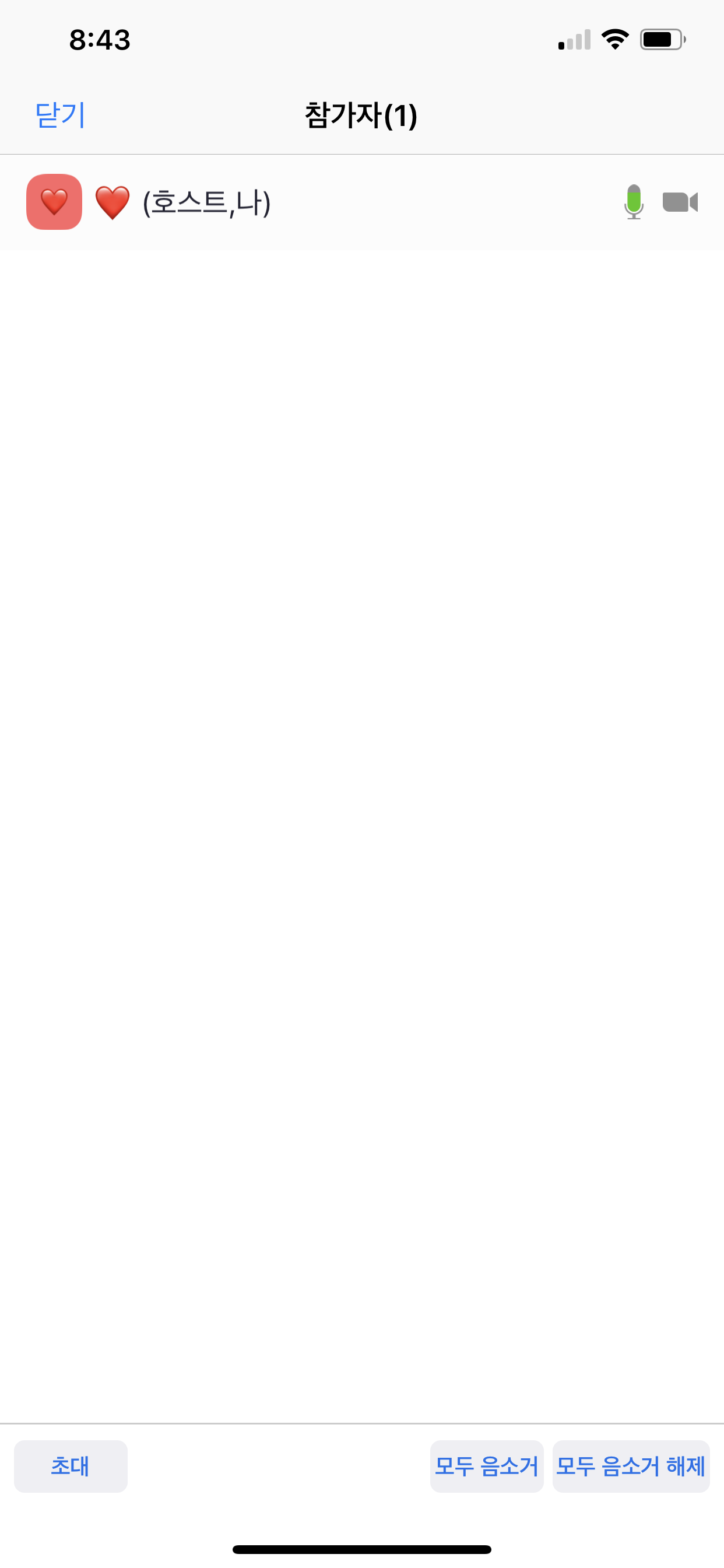 아까의 화상통화를 하고 있는 그 화면에서 아랫쪽에 더보기 버튼 옆에 있는 참가자 버튼을 누르게 되면 이런 하얀 창이 뜨게 되는데요. 제 이름 ♡ 옆에 보시면 초록색이 차오르고 있는 마이크가 눈에 들어오실 겁니다. 소리가 정상적으로 나오고 있다면 저 마이크의 초록색이 소리에 따라서 오르락 내리락을 하게 되는데요. 이 부분은 조금 더 자세하게 영상으로 담아왔습니다.