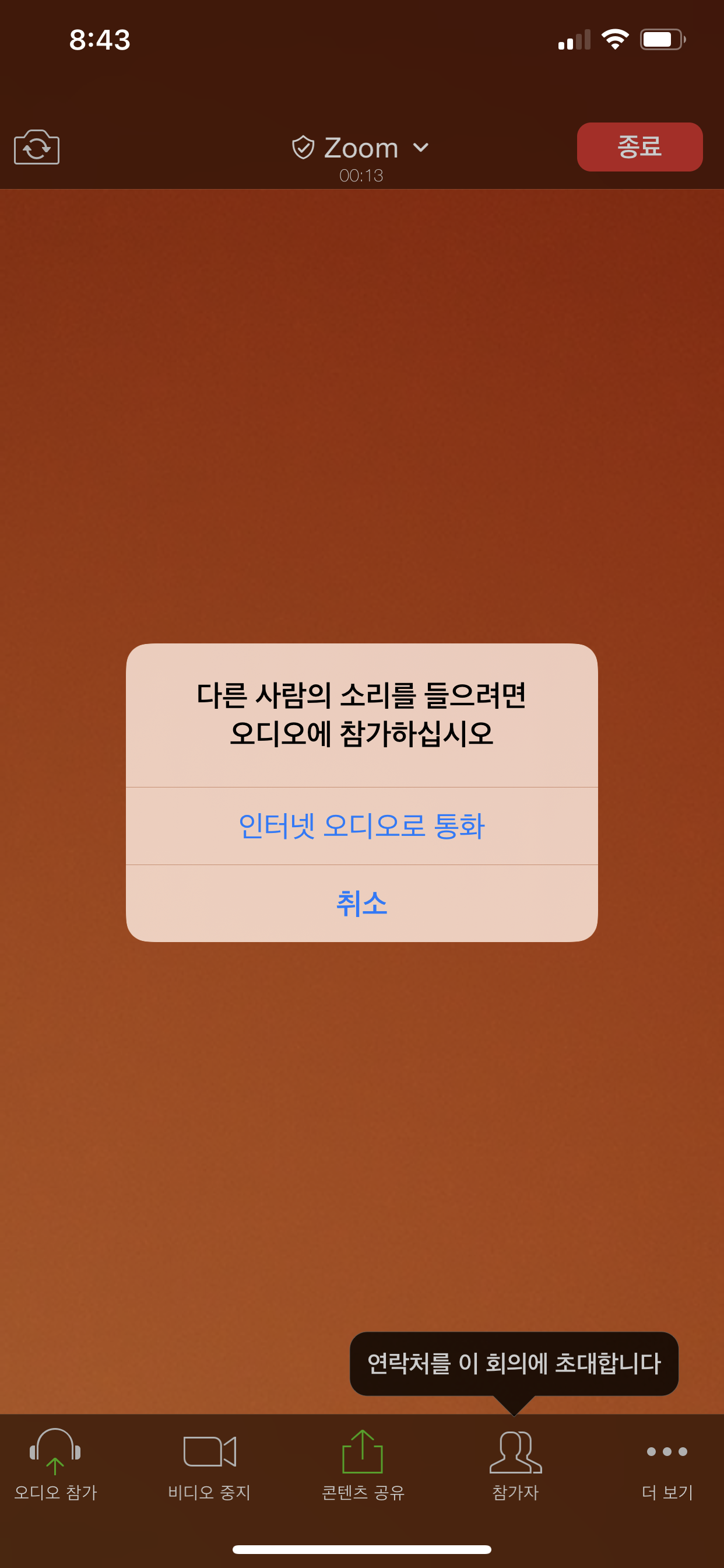 초반에 ZOOM 화상통화 회의실에 이렇게 접속을 하면 '다른사람의 소리를 들으려면 오디오에 참가하십시오'라는 팝업창이 뜨면서 '인터넷오디오로 통화' 라는 버튼과 '취소'라는 버튼이 나오게 됩니다. 이때 취소가 아니라 인터넷오디오로 통화를 눌러주셔야 정상적으로 ZOOM 화상통화를 할때 소리까지 정상연결이 가능합니다.
